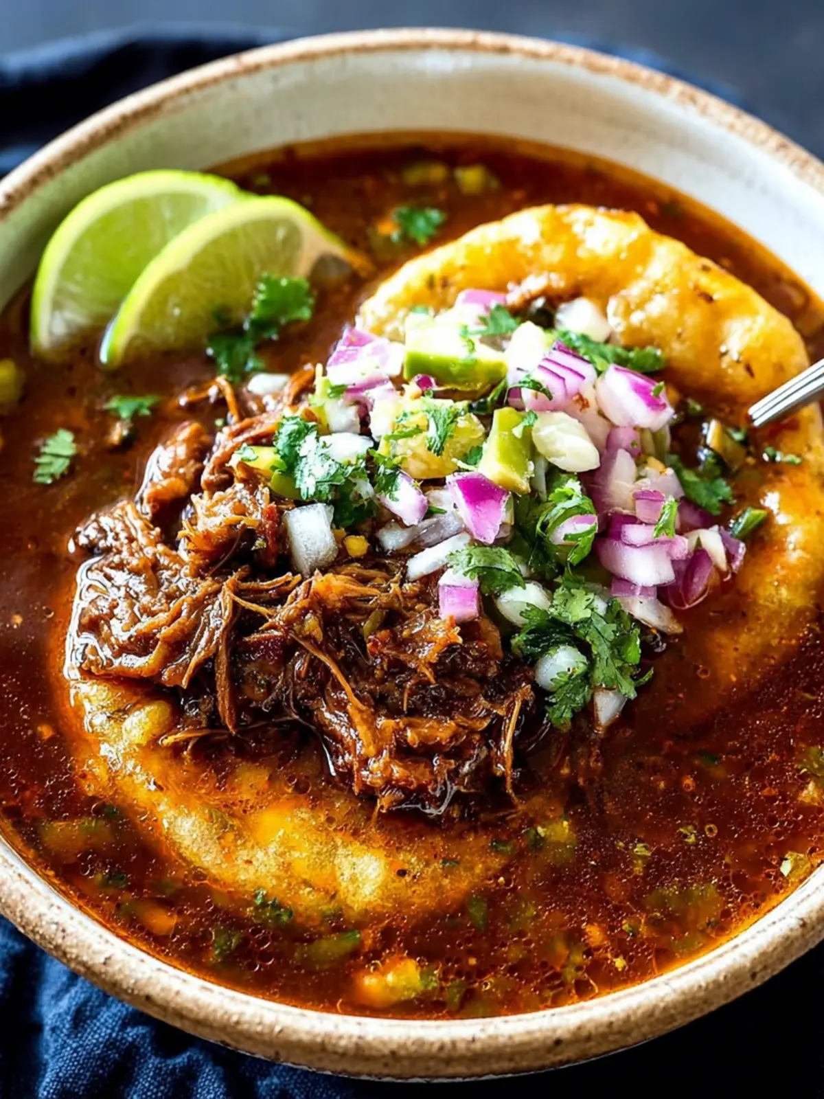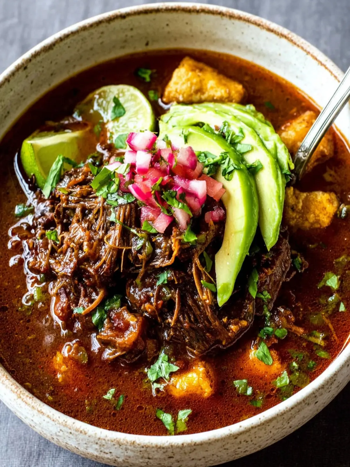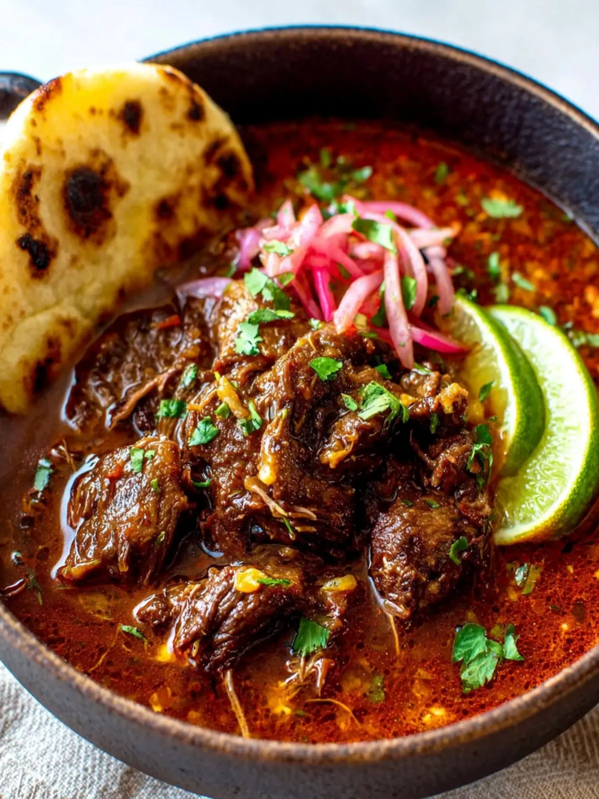 This rich and flavorful birria stew is perfect for tacos or served in a bowl, topped with fresh garnishes.