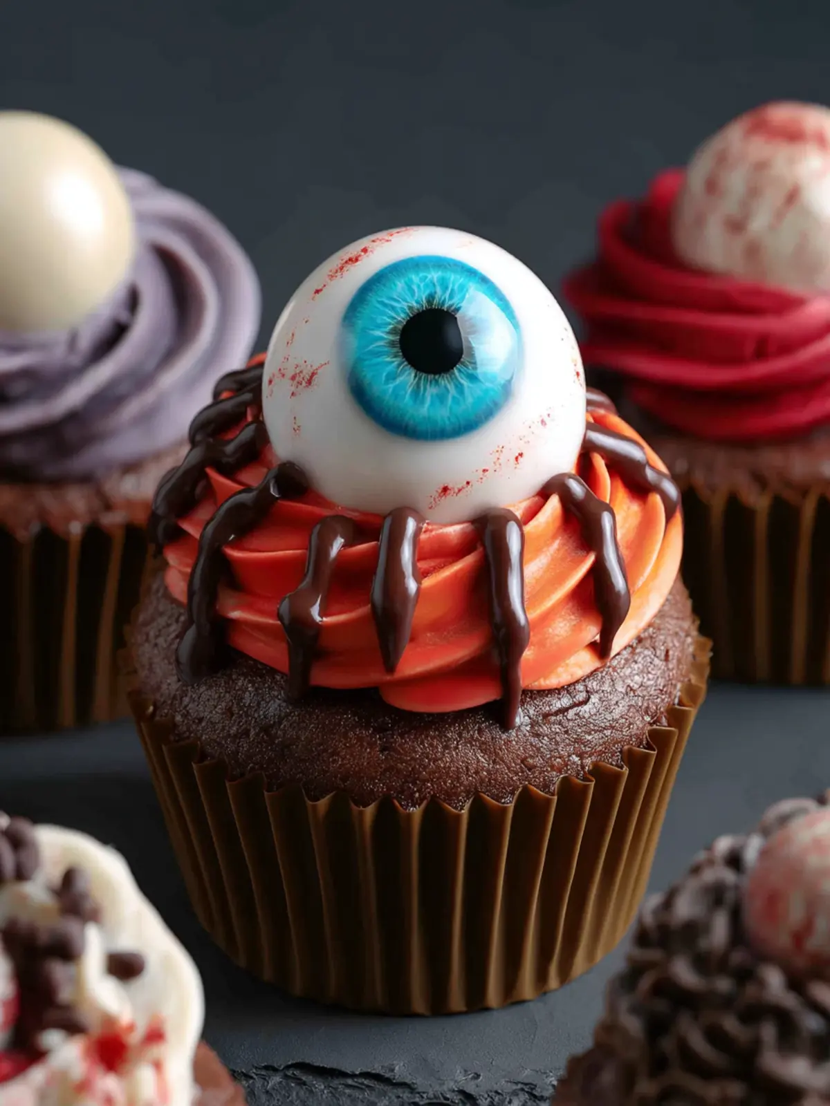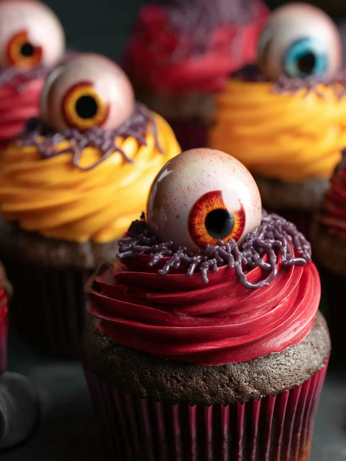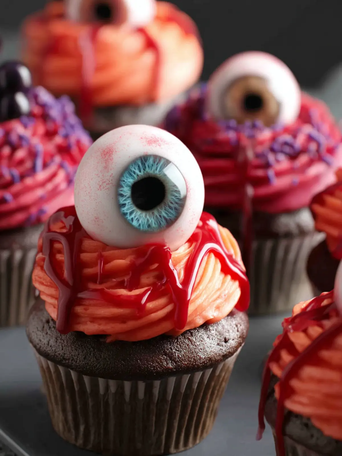 Delicious Halloween-themed cupcakes decorated with gummy eyeballs.