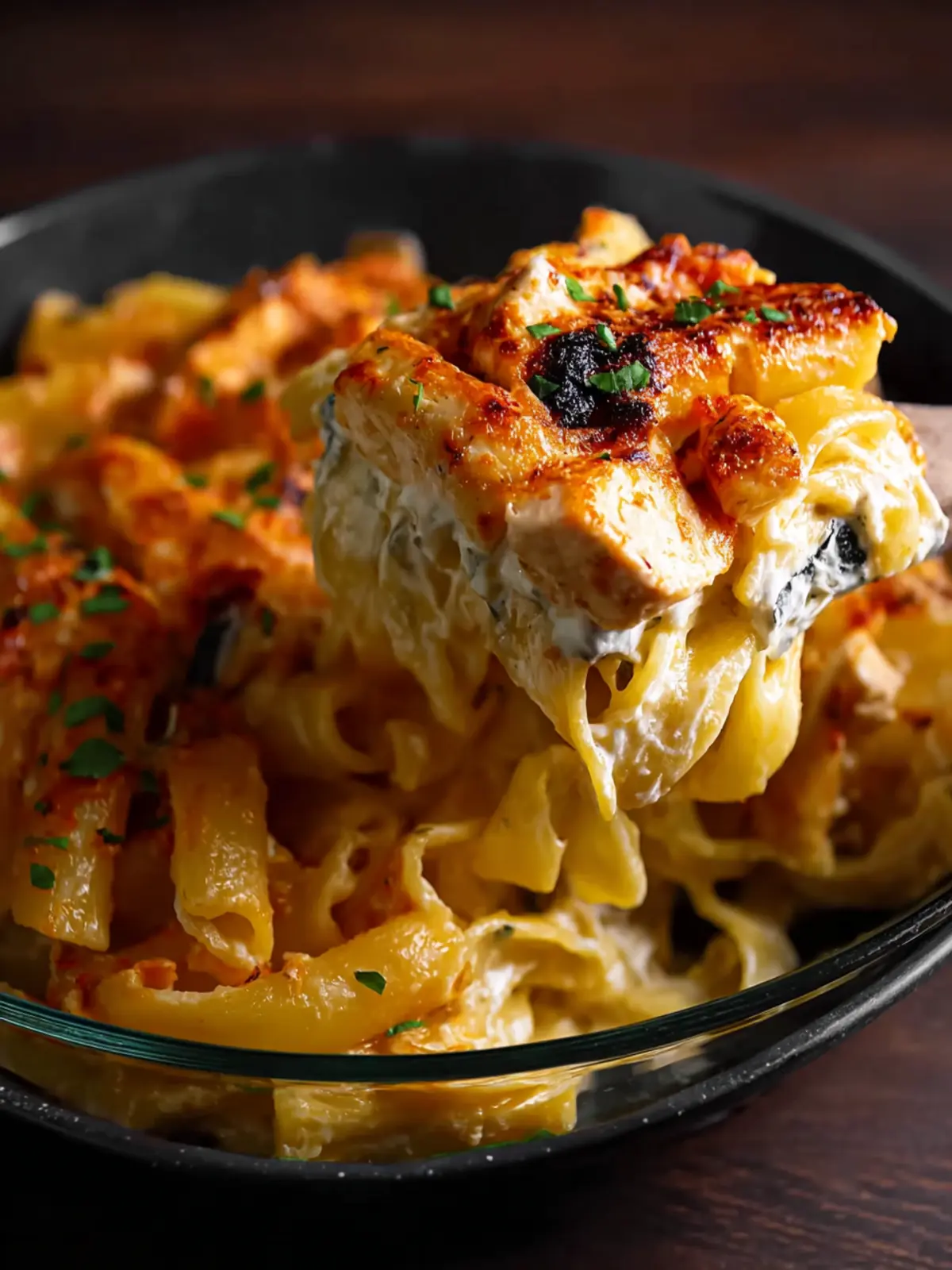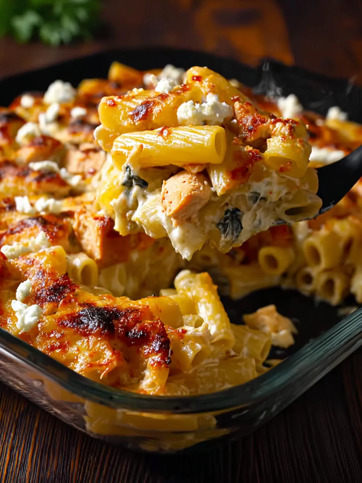 A creamy and spicy chicken pasta bake, perfect for a hearty meal.