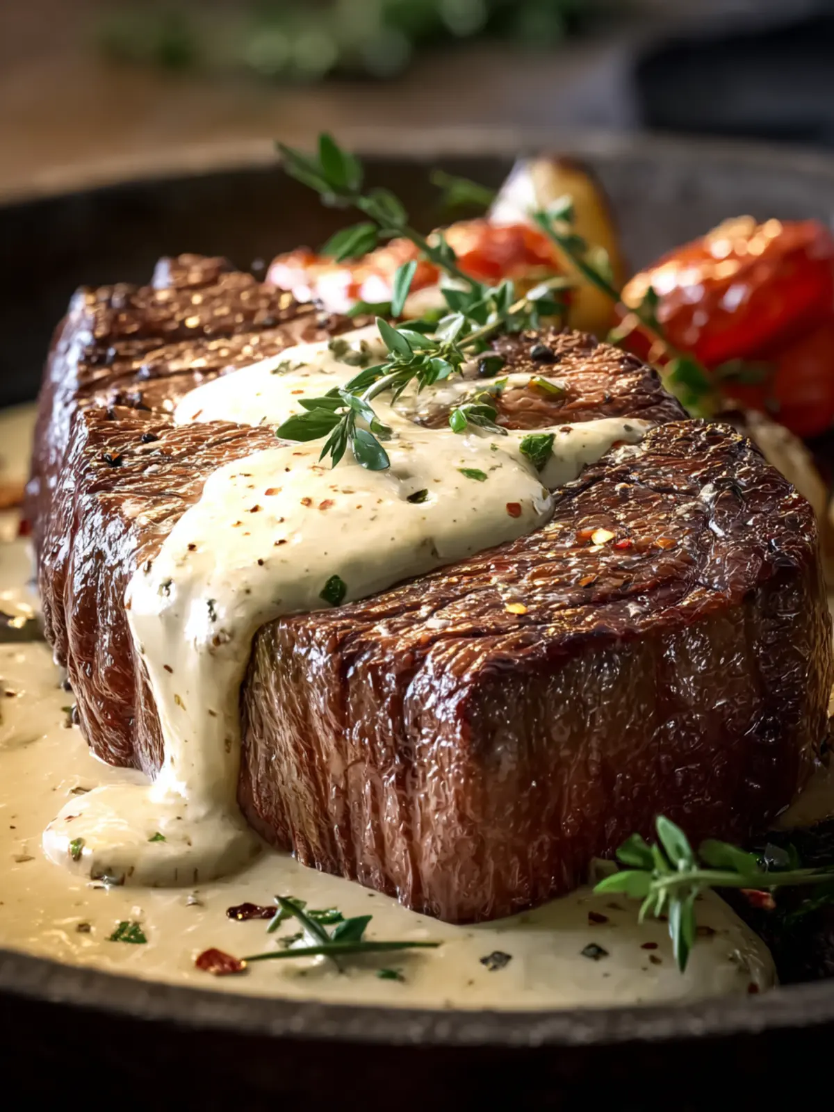 - Slice the rested steak against the grain and drizzle garlic cream sauce over it before serving.