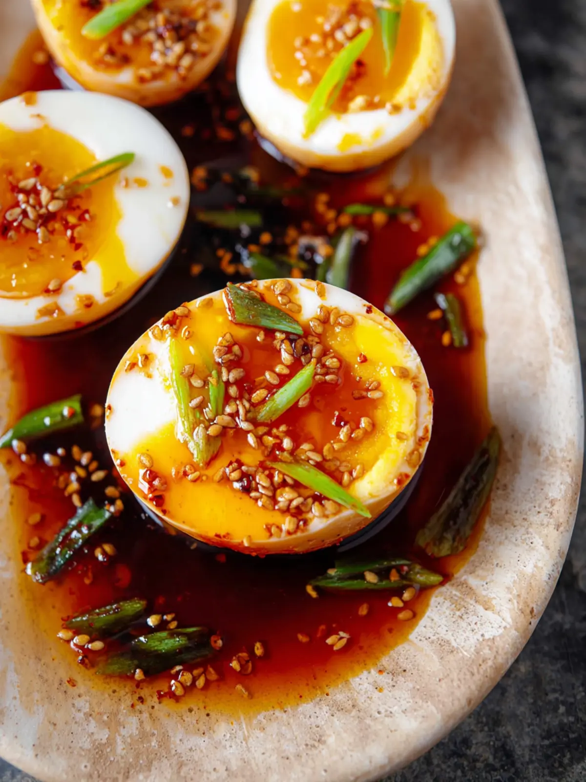• To elevate the dish, serve the eggs sliced in half atop a bed of rice or greens. Garnishing with sesame seeds and chopped green onions adds both color and texture.