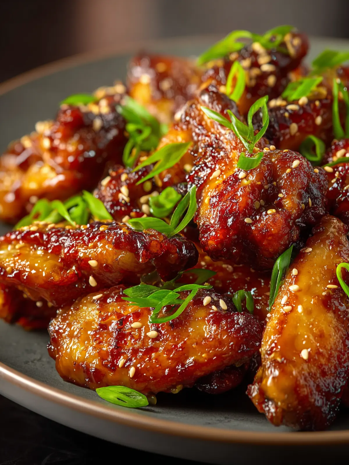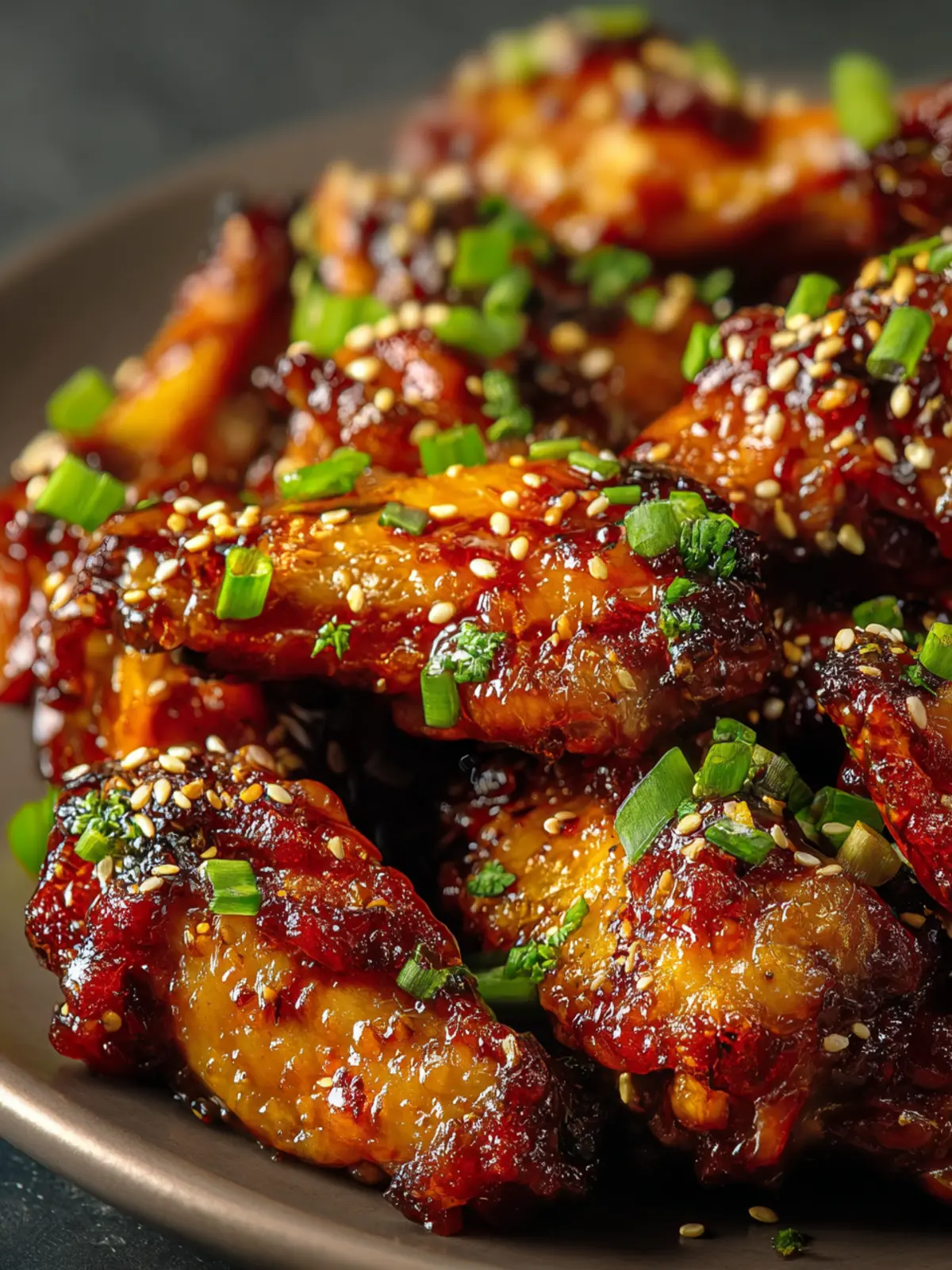 - Garnish and serve hot: Plate wings topped with chopped green onions and sesame seeds.