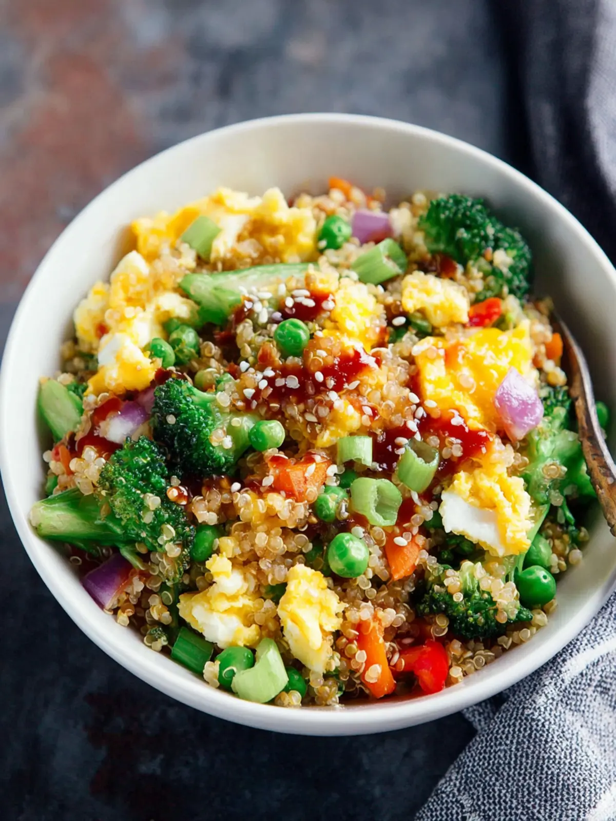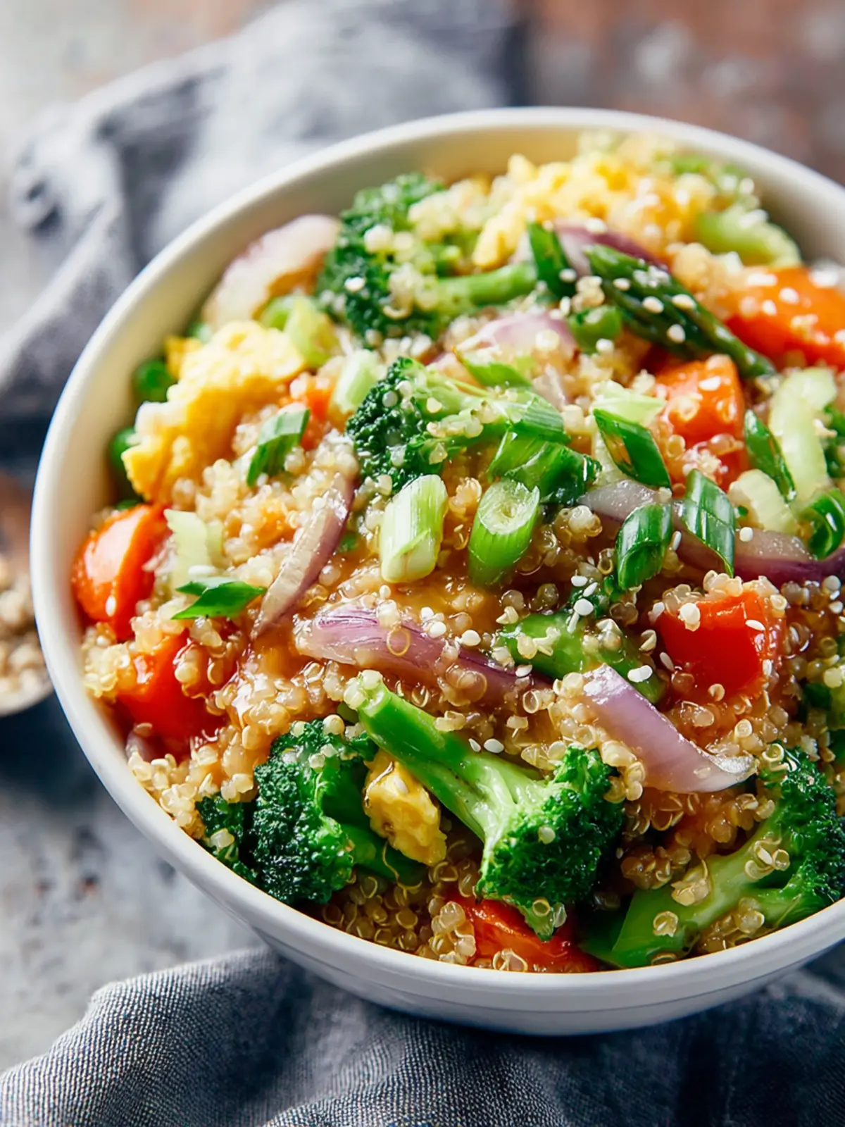 A delicious and nutritious quinoa vegetable stir-fry that combines eggs, a variety of frozen vegetables, and a savory sauce.