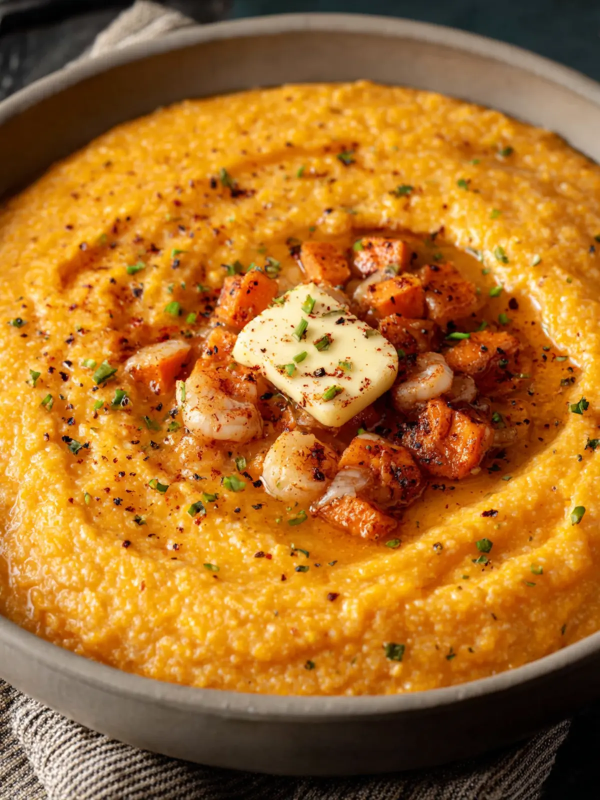A delicious and creamy dish made with sweet potatoes and stone ground yellow grits, perfect for a comforting meal.