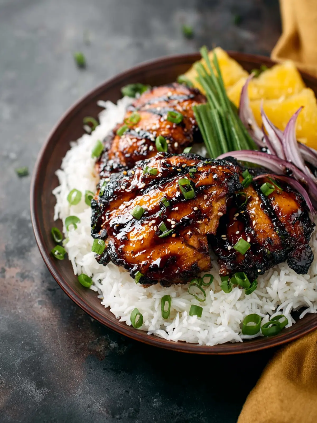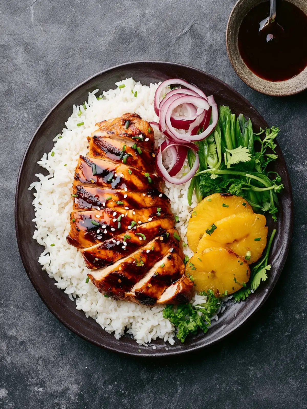 A delicious grilled teriyaki chicken served with coconut lime rice, grilled pineapple, and red onion, garnished with fresh cilantro and toasted coconut.